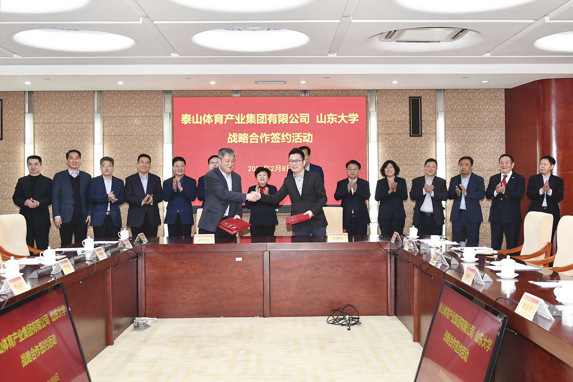 党的十九届五中全会提出,到2035年基本实现社会主义现代化远景目标,建成文化强国、教育强国、人才强国、体育强国、健康中国。泰山集团与山东大学的战略合作本着“优势互补、资源共享、合作共赢、共同发展”的原则,秉承“技术指引、特色发展、示范先行、品牌培育”的宗旨,需求牵引、精准对接,构建集协同创新、学术交流、人才培养、成果转化、示范应用于一体的高水平、开放式体育科技创新及成果转化平台,实现产教融合和产学研深入合作,共同打造国内领先的校企合作典范。签约仪式上,山东大学体育学院党委常务副书记郭学庆介绍了双方合作的基本情况,山东大学常务副校长王琪珑与泰山集团副董事长卞青峰签订战略合作协议,山东大学校长樊丽明与泰山集团董事长卞志良共同为研究生联合培养基地揭牌。
